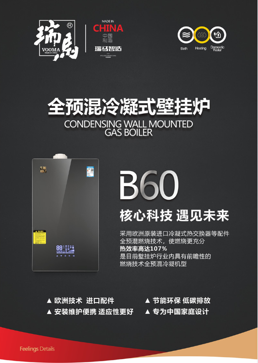 瑞馬全預(yù)混冷凝燃氣壁掛爐,采用歐洲原裝進口冷凝式熱交換器等配件,全預(yù)混燃燒技術(shù),使燃燒更充分,同時降低氮氧化合物(NOx)和一氧化碳(CO)的排放,熱效率高達107%,解決了目前乃至未來很長時間的市場對高效率、低排放、節(jié)能環(huán)保壁掛爐的需求。